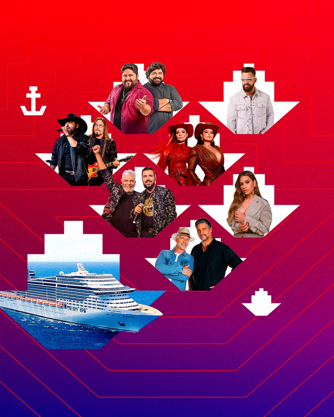 Grandes nomes já estão confirmados: César Menotti & Fabiano, Dennis, Edson & Hudson, Maiara & Maraisa, Matogrosso & Mathias, Simone Mendes e Victor & Leo! Um festival inesquecível em alto-mar, com festas temáticas, comida típica e muita tradição!