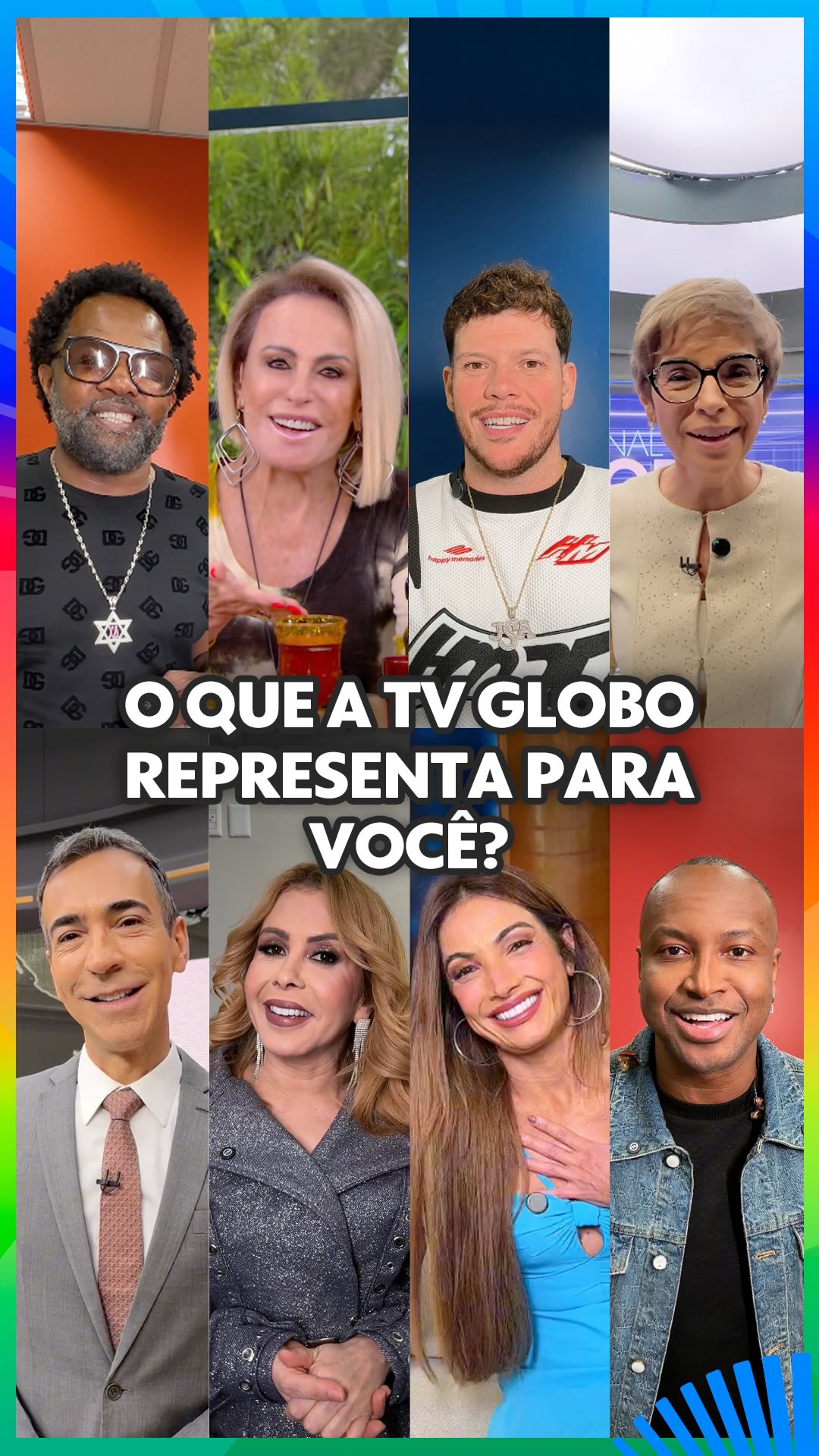 Pra mim ela representa uma vida ….eu sempre fui muito pobre ( ainda sou rsrs) porém quando não estava na escola pública estava vento a tv globo …desenhos ,jornais e as novelas .. então ela foi minha 3 família ….e e um prazer segura 😍 parabéns tv globo 😍